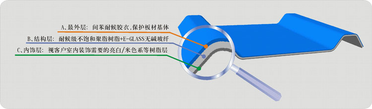 傳統防腐瓦為:高性能上膜+無堿玻璃纖維和不飽和聚酯(樹脂)+下膜